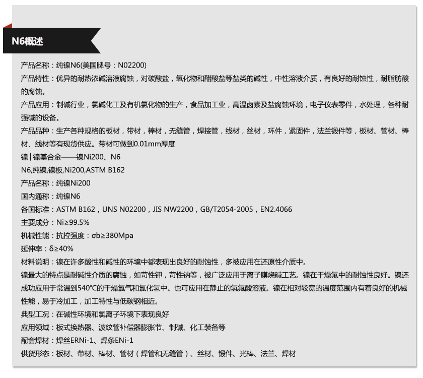 N6管材可分別稱為N6不銹鋼管、N6鋼管、N6不銹鋼無(wú)縫管、N6無(wú)縫管、N6不銹鋼焊管、N6焊管、N6不銹鋼精密管、N6精密管、N6毛細(xì)管等。