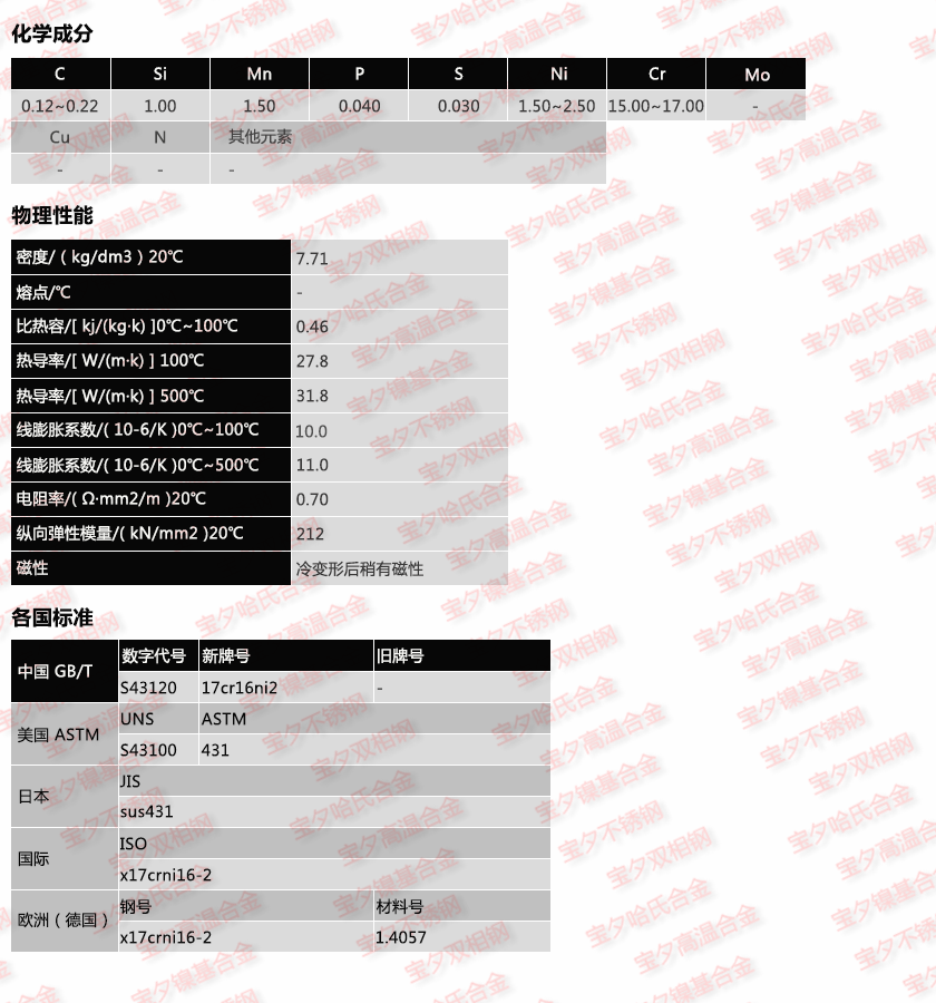 寶鋼17Cr16Ni2,太鋼17Cr16Ni2,新日鐵17Cr16Ni2,日本冶金17Cr16Ni2,蒂森克虜伯17Cr16Ni2,奧托昆普17Cr16Ni2,日本神戶17Cr16Ni2